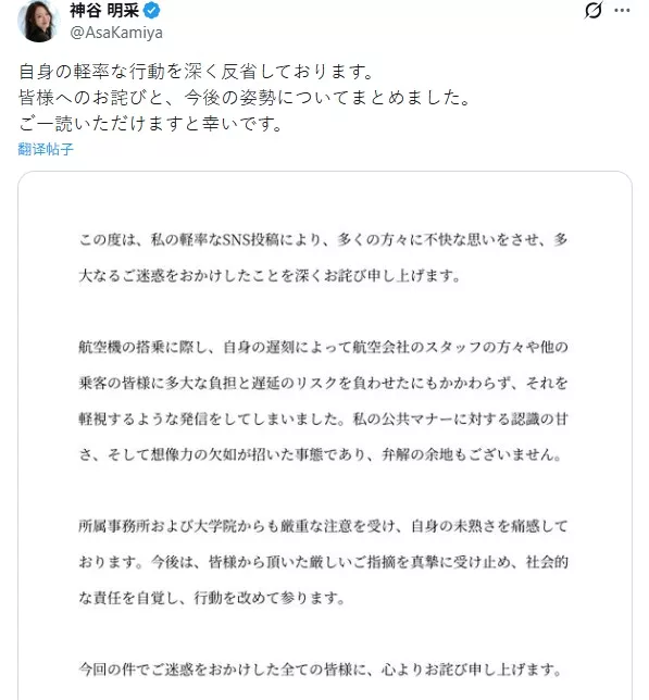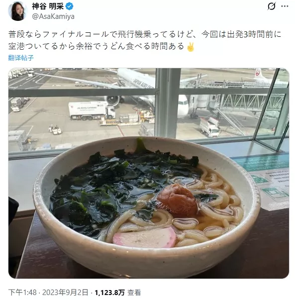 此外,也有网友挖出神谷明采过往的贴文,指责她是“压线搭机惯犯”,早在2023年就曾发文称“平常的话,我都是在最后广播才上飞机”,但当天因提早抵达机场,才能从从容容的吃碗乌龙面。