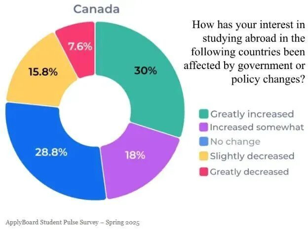 教育平台ApplyBoard发布了《2025春季国际学生意向调查报告》显示,94%的受访者对加拿大留学感兴趣,其中55%表示“极其感兴趣”;30%的受访者表示新政反而增强了他们的留学意愿。