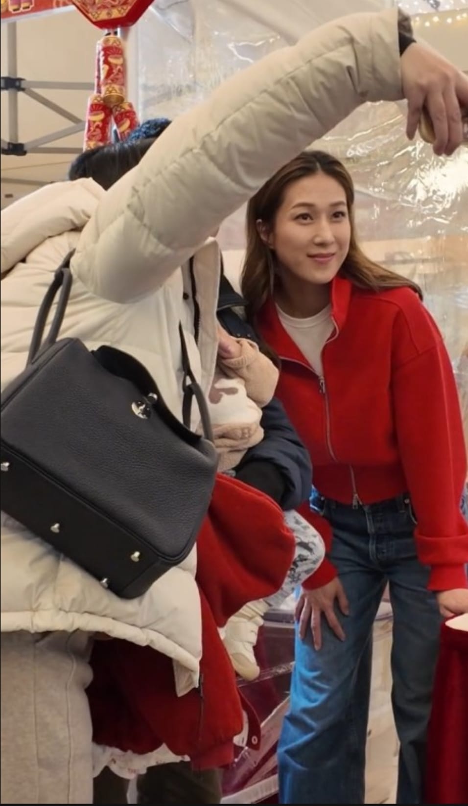 活动当日,钟嘉欣身穿一件鲜红色拉链外套,配搭简洁的白色内搭和牛仔裤,一身打扮充满活力,完全看不出已是三孩之母。