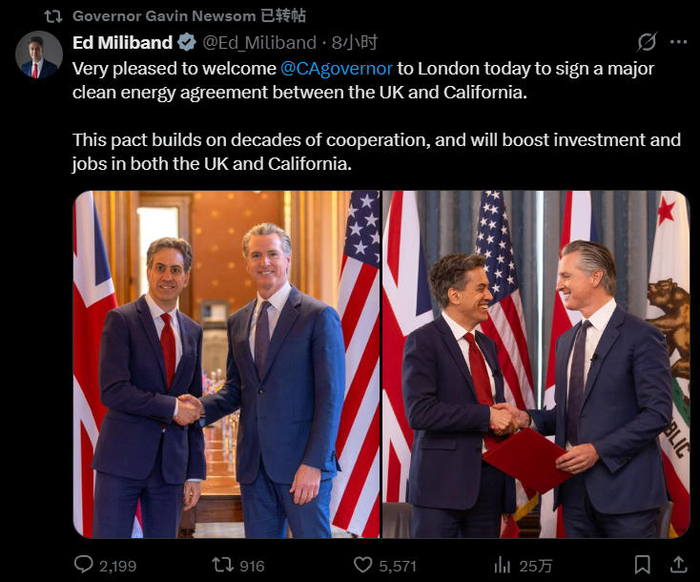 川普的言论是在纽森当天于伦敦与英国能源大臣埃德·米利班德签署协议后不久发表的。