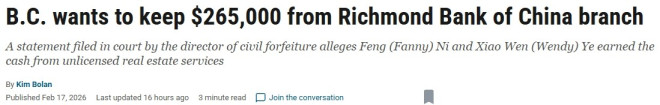 法庭文件显示,位于列治文中国银行分行的一个账户内,26.5万加元及利息面临被政府充公,原因涉及无牌房地产交易、洗钱以及未申报收入。更引发关注的是,涉案公司曾以全中文网站向华人推广BC房产,并通过微信安排看房。