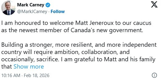 根据总理卡尼在社交媒体上的一则帖子,保守党国会议员Matt Jeneroux将加入自由党党团。