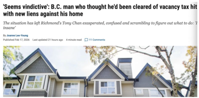 据《温哥华太阳报》2月17日报道,一位列治文华裔居民几年前曾因投机和空置税而遭受损失,但后来这些指控被撤销。他说,省政府又对他的房产提出了新的留置权。