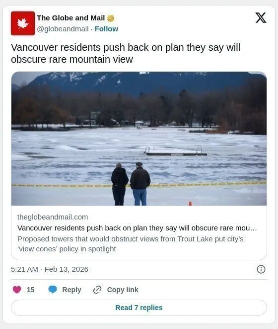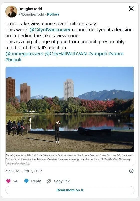 根据省政府的交通导向开发法规,天车站200米范围内建筑高度至少应达20层。市府已收到两份可能影响Trout Lake视野的开发申请,包括Victoria Drive 2611号26层住宅和East Broadway 1926-1978号33层住宅。现行政策仅允许约12层,市府称该高度对开发商而言财务上较难可行。