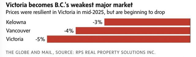 根据Wahi-RPS的房价数据,维多利亚1月取代了温哥华,成为BC省最疲软的市场,跌幅5%,而温哥华跌幅为4%。