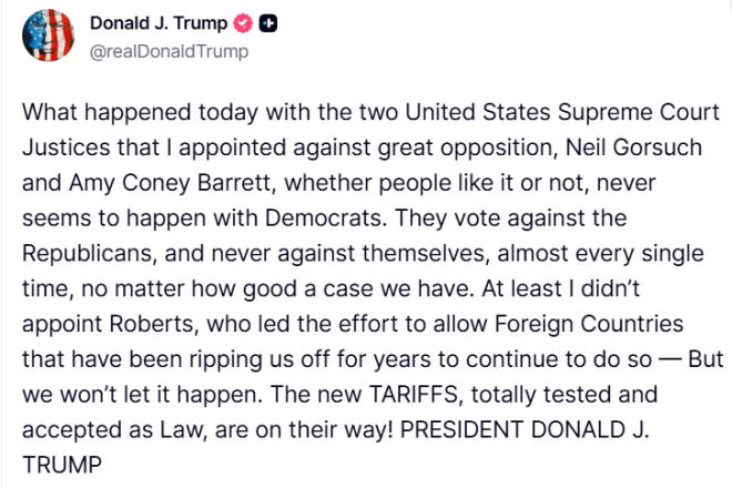 川普在Truth Social上写道,“我非常荣幸刚刚在椭圆形办公室签署了一项针对所有国家的全球10%关税”。
