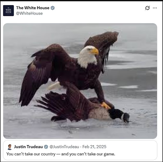 社交媒体迅速沸腾,华盛顿方面也第一时间加入了这场胜利的狂欢。白宫官方账号在比赛结束后发布了一张颇具象征意味的图片:一只展翅的白头鹰牢牢压制住一只加拿大鹅,寓意不言自明。