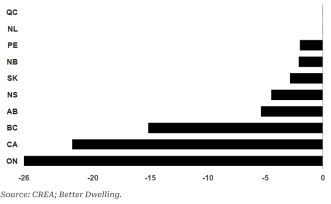 全国房价虽然下降,但细分数据表明这明显是一个区域性故事。业内人士一直提醒这一点,但值得注意的是,BC省和安省历来引领市场。它们在上涨时领先,而未来是否也会在下跌中继续领先,还有待观察。