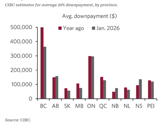 房价下降显著减少了买家需要准备的首付金额。该银行估计,平均20%首付比2022年低约22.000加元,但这种缓解仅限于少数最昂贵的省份。大多数省份的平均首付仍然是六位数,安省接近30万加元,BC省甚至更高。这对那些刚试图进入房地产市场的家庭来说,是一个极高的门槛。