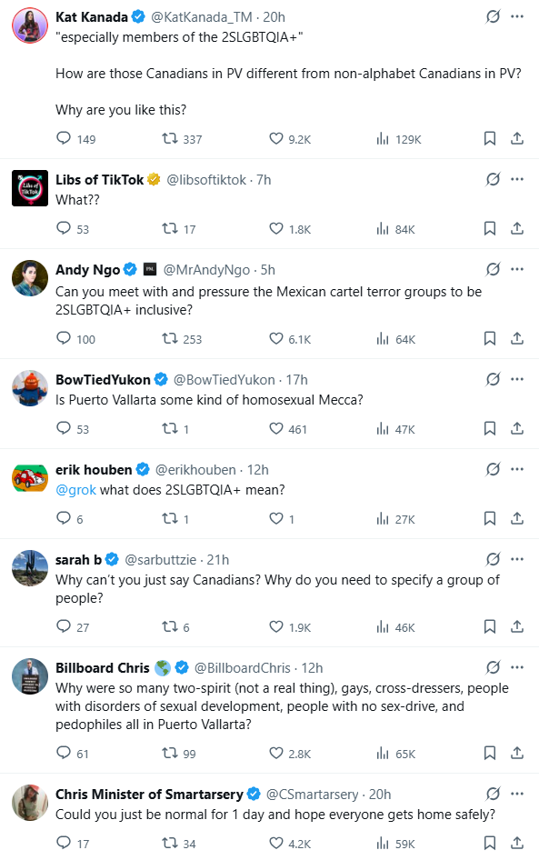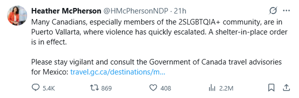 “很多加拿大人,尤其是2SLGBTQIA+群体成员,目前正在Puerto Vallarta,当地暴力局势迅速升级。现已实施就地避难令(shelter-in-place),”身兼Edmonton国会议员的McPherson写道,并附上联邦政府关于墨西哥旅游警示的网页链接。