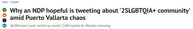 周日晚上,加拿大新民主党(NDP)党领竞选人Heather McPherson在社交媒体上发文谈及墨西哥旅游城市Puerto Vallarta不断升级的贩毒集团暴力事件时,被批刻意加入进步派(左派)的政治表态,引发争议。