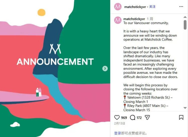 “我们怀着沉重的心情宣布,Matchstick Coffee即将停止营业”,咖啡馆上周五早上在Instagram上写道,“过去几年,我们行业的格局发生了翻天覆地的变化。和许多独立企业一样,我们面临着日益严峻的挑战。在尝试了所有可能的途径后,我们最终做出了艰难的决定,关门歇业”。