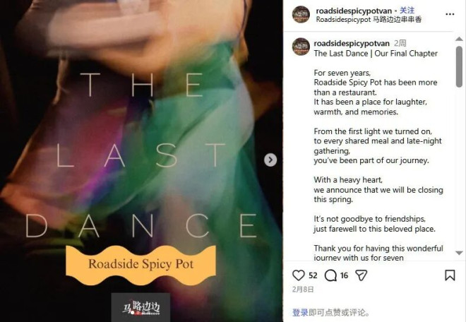 “七年来,马路边边麻辣锅不仅仅是一家餐厅”,餐厅在Instagram上写道,“这里充满了欢声笑语、温暖和回忆。从我们开门营业的第一盏灯,到每一次共享美食和深夜聚会,你们都一直是我们旅程的一部分”。