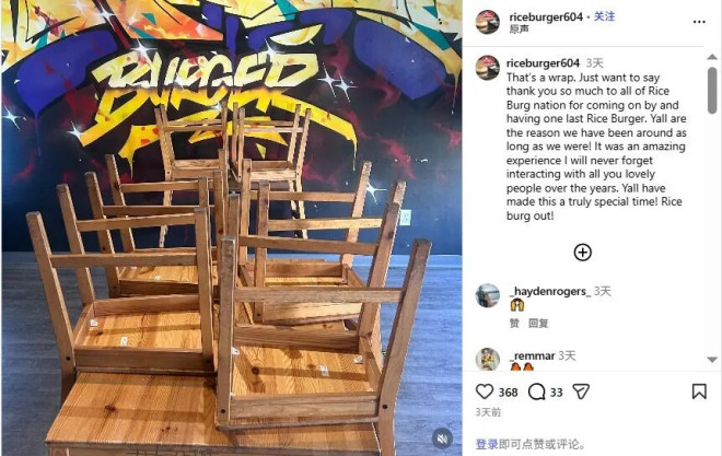 温哥华多家餐厅关门歇业,其中就包括Rice Burger。这家餐厅在 Instagram 上宣布,在经营九年后已经关门。