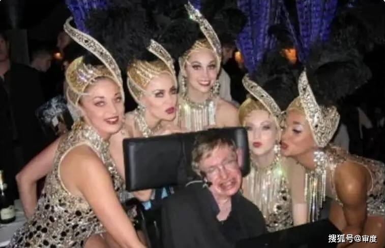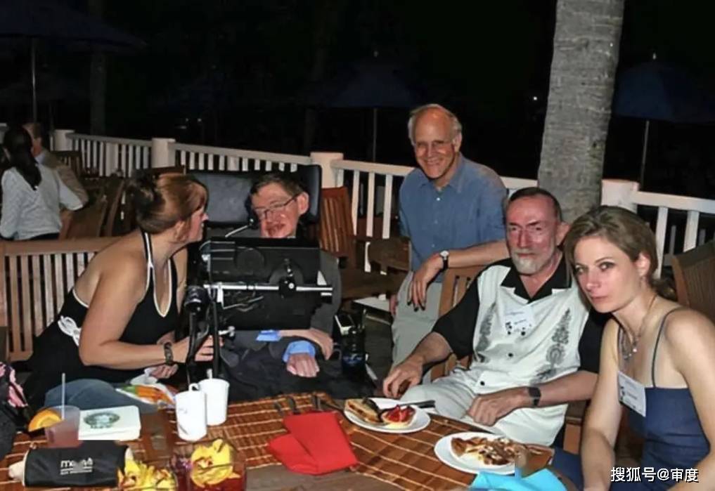 照片中,因罹患渐冻症长期依靠轮椅生活的霍金,躺在一张沙滩椅上,左右各有一名身穿比基尼的女性陪伴,他手中拿着一杯红色饮料,背景疑似热带岛屿。