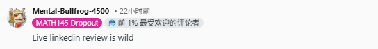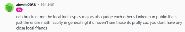 “兄弟,相信我,本地学生,尤其是计算机专业的,也会当众互相看对方的 LinkedIn评头论足。说实话,这在数学系很常见。如果你没见过,多半是因为你还没有特别熟的本地朋友。”