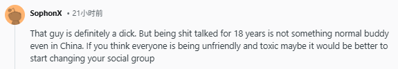 “那家伙确实有毒。不过兄弟,被人说闲话说了整整18年,这可不正常——如果你觉得身边所有人都不友好、都有毒,或许更该考虑的是,换一换你的社交圈子。”