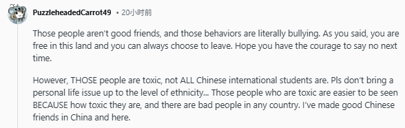 “那些人根本不是真正的朋友,他们的行为说白了就是在霸凌。正如你所说,你在这片土地上是自由的,你随时可以选择离开。希望你下次有勇气说‘不’。不过,需要强调的是——有毒的是那些人,而不是所有中国留学生。请不要把个人生活中的不愉快上升到族裔层面......我们之所以更容易注意到那些有毒的人,正是因为他们的行为太有毒、太显眼了。任何国家都会有不好的人。我在中国和这里都结交了很好的中国朋友。”