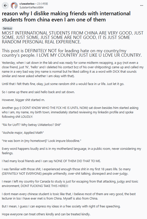 近日,一条发布在Reddit滑铁卢大学版块的帖子,引发广泛关注和讨论。发帖人自称是中国留学生,但标题却很刺眼:“为什么我不喜欢和中国留学生交朋友——尽管我自己也是。”