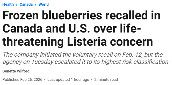 在加拿大和美国分销的近60.000磅冷冻蓝莓正在被紧急召回,原因是可能受到单核细胞增生李斯特菌(Listeria monocytogenes)污染。
