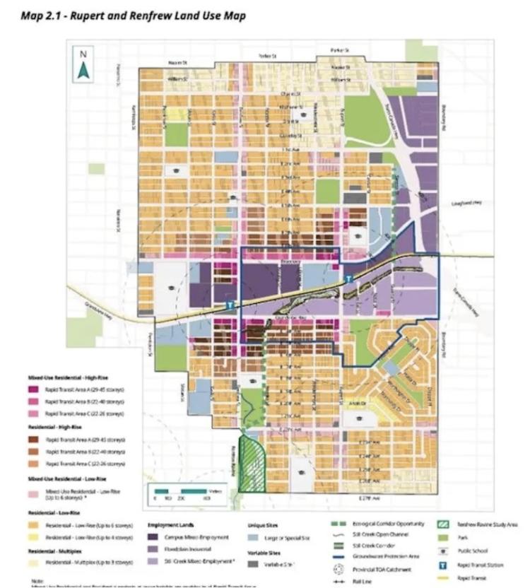 这次规划涉及将近2600块地,主要是在Rupert和Renfrew天车站的周边区域,范围涉及从Boundary Rd到Kamloops Ave,从Parker Ave到29th Ave,总面积6.6平方公里,基本都是住宅区。