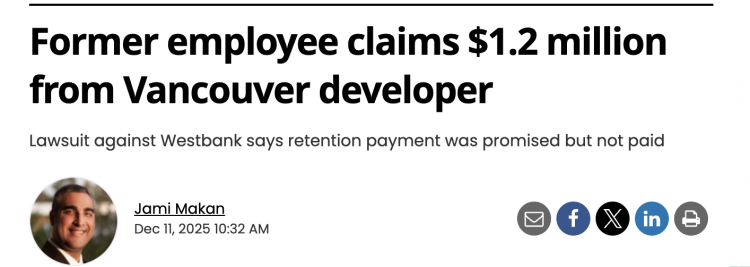 2025年12月,Westbank前副总裁Rhiannon Mabberley 向BC省最高法院提起民事诉讼,索赔$120万留任金。