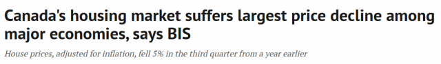 加拿大房市的情况有多严重,可能超乎想象。国际清算银行(BIS)报告让人看的触目惊心。据加拿大《环球邮报》24日报道,加拿大住宅房价经通胀调整后的跌幅,已经在在同类发达经济体中位居榜首。