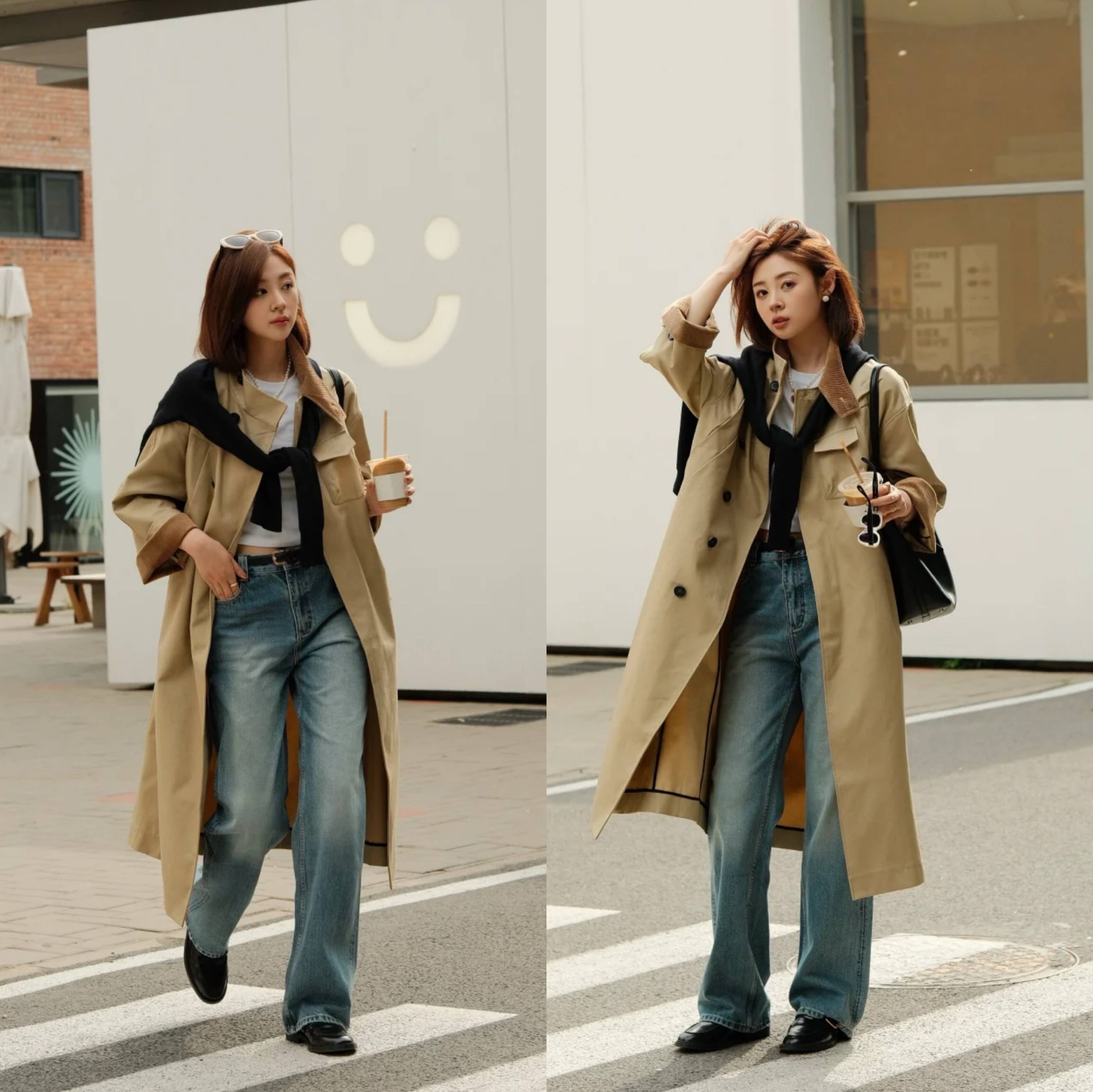 相比之下,直筒牛仔裤的搭配最为简单,与卡其色风衣搭配,中规中矩,简单不出错,但是却经典,可以从细节方面致胜,比如超短款内搭的小心机,或者搭配一件毛衫当披肩来打造随性感,都能提升整体穿搭的气质。