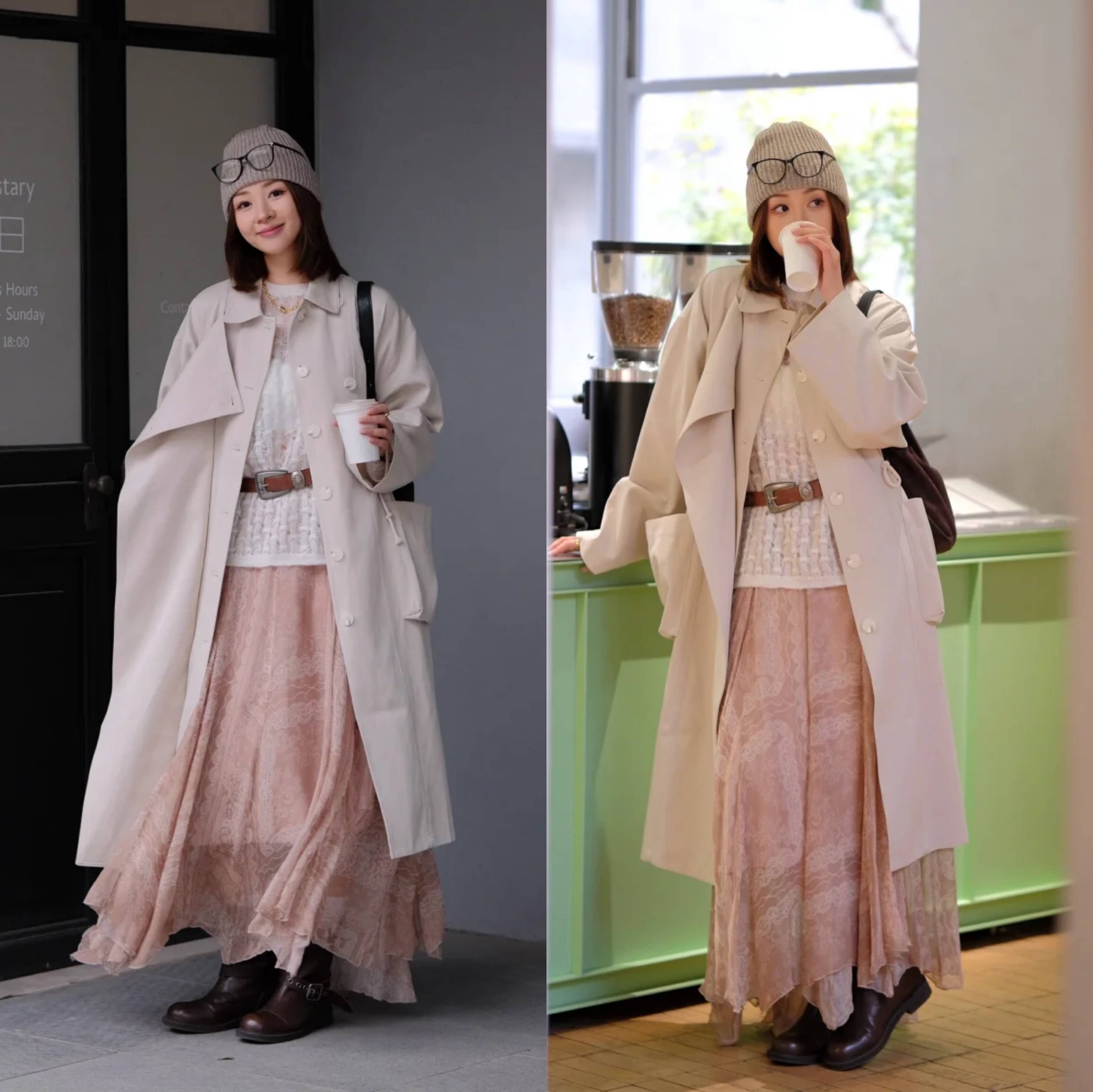 女性穿搭怎能没有裙子呢!风衣的帅气与裙子的韵味相结合,打造优雅又极具女人味的气质穿搭。
