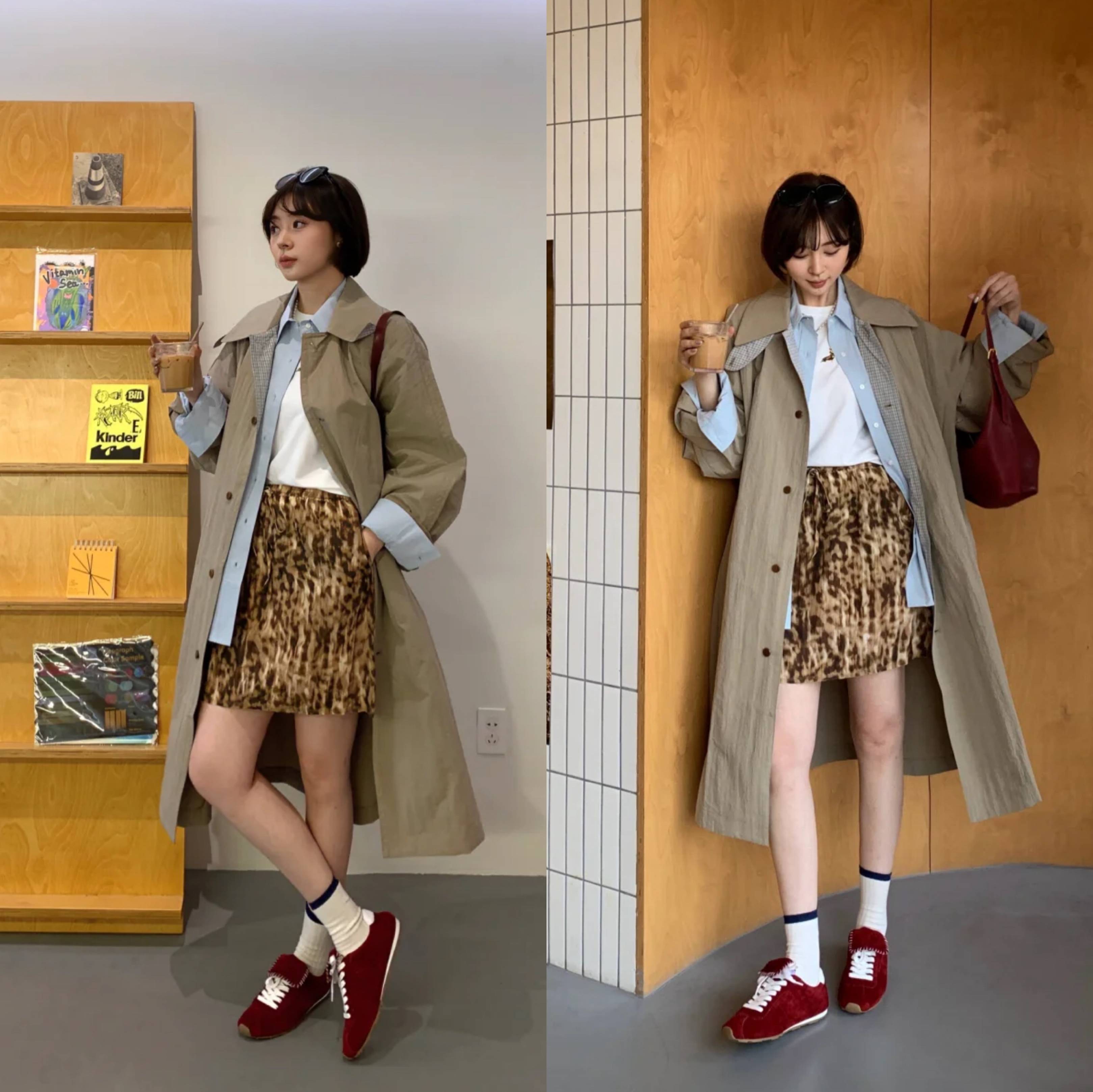 以短裙为例,卡其色长款风衣叠穿衬衫内搭白色T恤打底,下半身选择撞色带有图案的短裙,让整体穿搭更加有亮点,而且叠穿的层次感丰富,害怕出错,可以选择同色系内搭,这种搭配方式显瘦效果非常好。