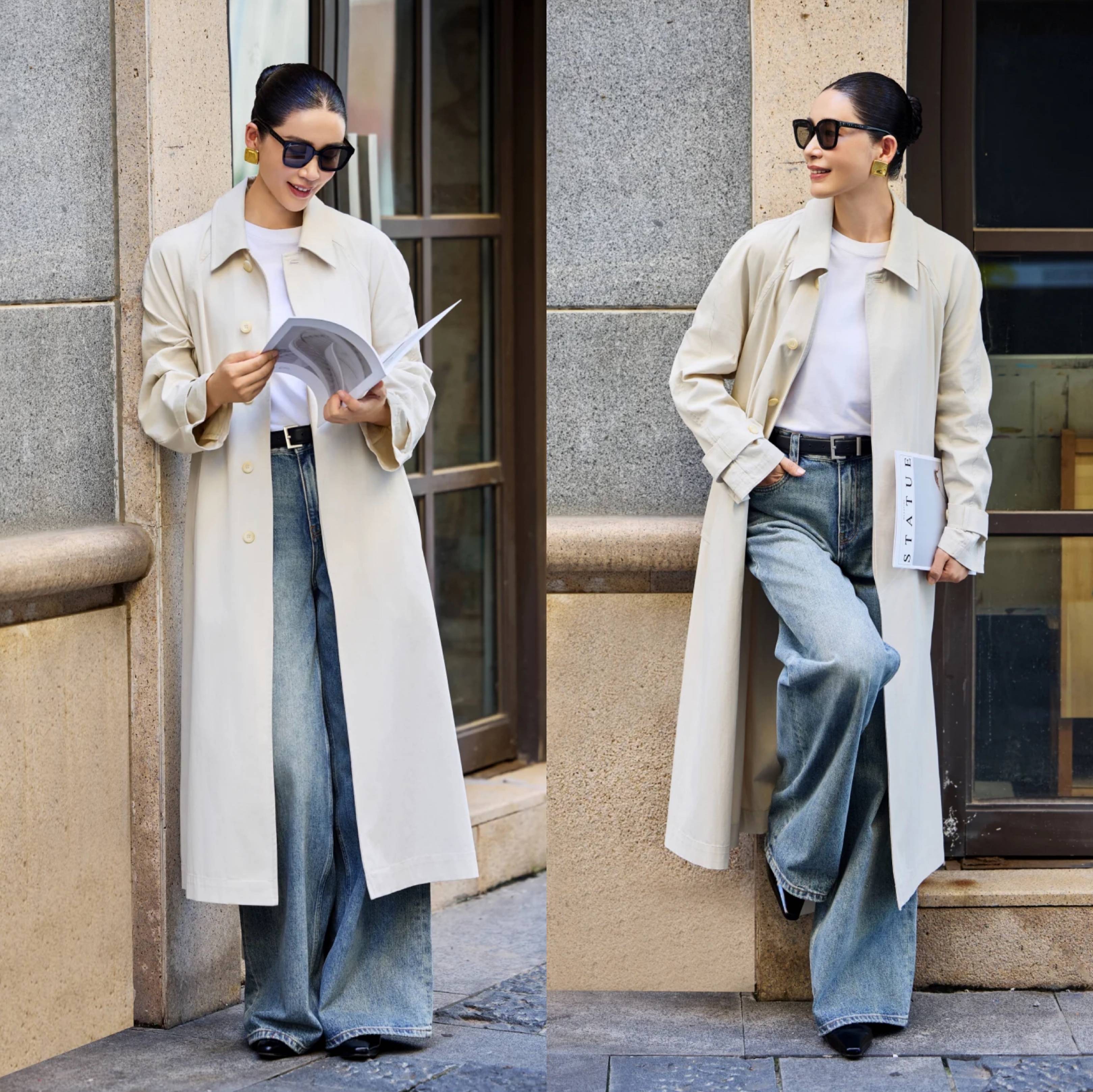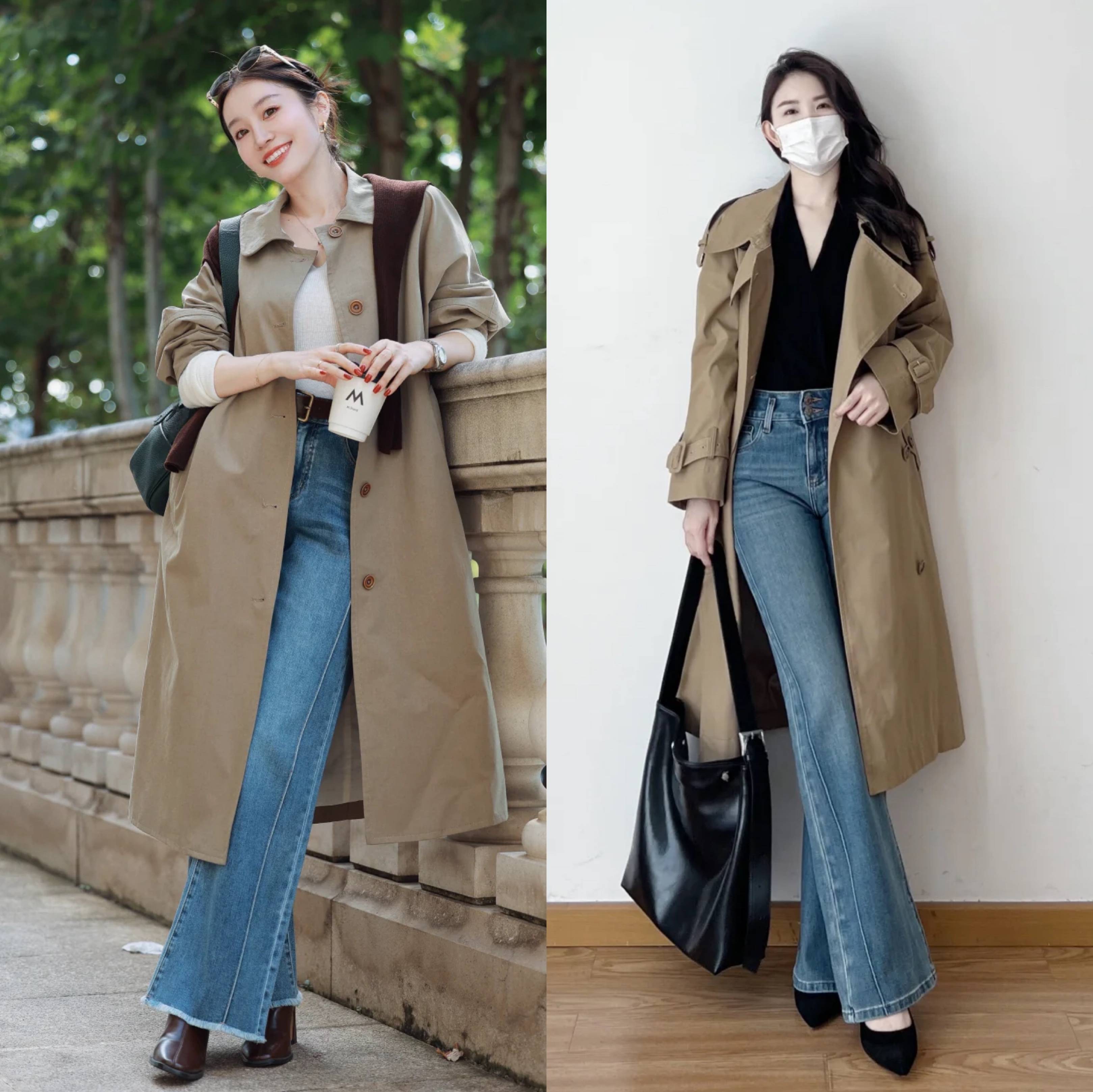 牛仔阔腿裤,与风衣搭配,风衣推荐直筒版型,更简约更利落,这种搭配对身材要求比较高,适合苗条且高挑的身材,身材不够高挑,可以选择高腰款牛仔阔腿裤,然后裤腿版型尽量选择窄版,裤长也要控制不要太长,配合高跟鞋或者短靴。