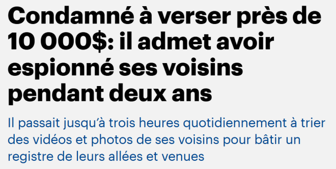 一名蒙特利尔男子因用监控摄像头对邻居进行长达两年的监视,被法院判处向邻居赔偿近10.000加元。