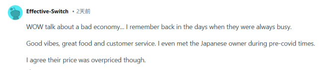 “现在经济也太差了吧……我记得以前他们总是很忙。氛围很好,食物也不错,服务也很棒。疫情前我甚至还见过那位日本老板。不过说实话,他们的价格确实有点偏高。”