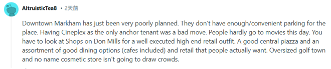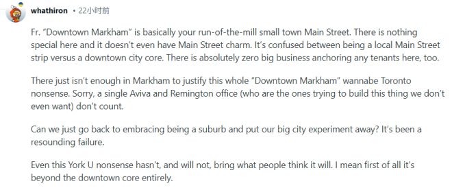 “说实话,‘万锦市中心’本质上不过就是一条普通的小镇商业街,没有什么特别之处,甚至连传统街区该有的吸引力都没有......而且,这里完全没有任何大企业作为‘核心引流’支撑商户。说白了,万锦根本没有足够多的东西来支撑这个所谓的‘万锦市中心’,我们能不能就坦然接受这里是个郊区?为什么非得硬凹‘市中心’人设?这场尝试可以说是彻底失败。就连约克大学那个项目,也没能、也不可能带来大家期待的效果。”
