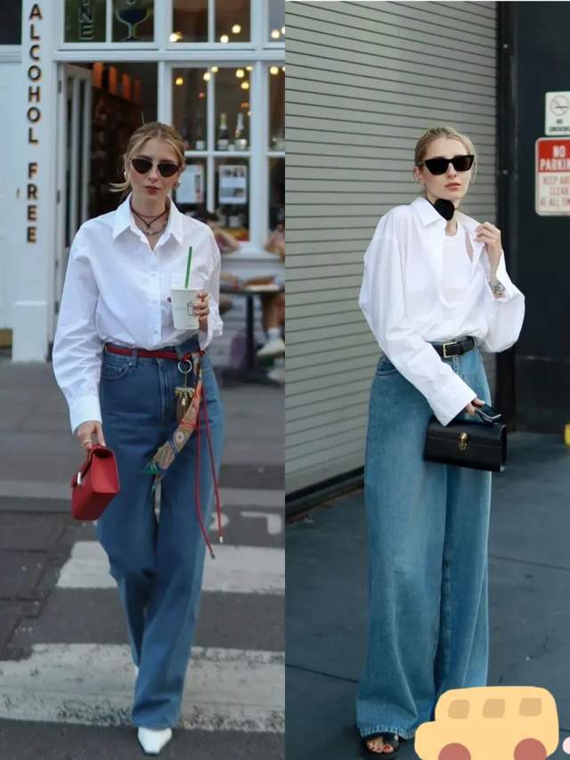例如上面这一款黑色的小方包,或者是红色的小方包,搭配白色衬衫和蓝色牛仔阔腿裤,整体穿搭经典耐看,有了包包的点缀,使得整个造型的配色更上一个档次。