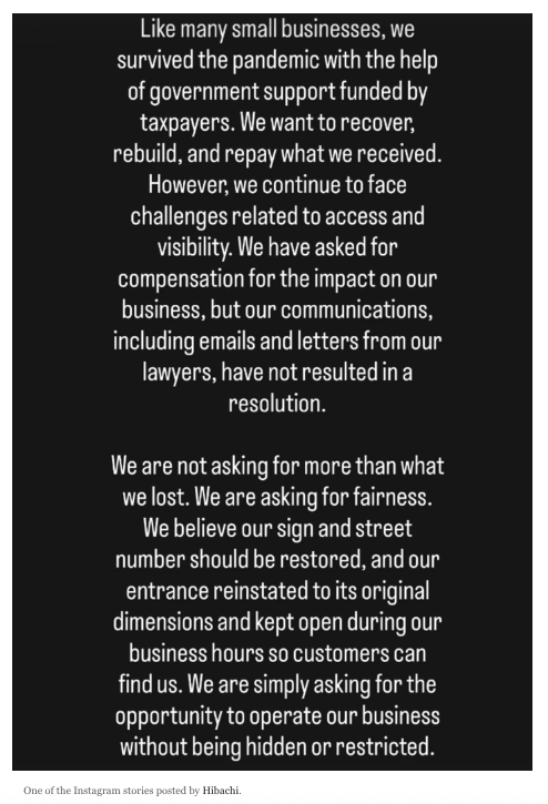 餐厅在一则Instagram Story中写道:“我们并不是要求额外的东西,我们只是希望恢复原本拥有的一切。我们认为,餐厅招牌和门牌号应当被恢复,入口也应恢复至原本尺寸,并在营业时间保持开放,让顾客能够找到我们。”