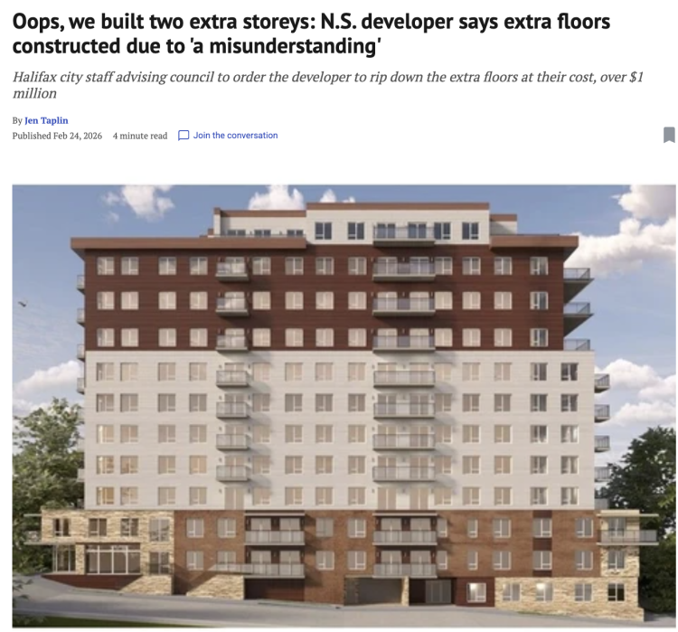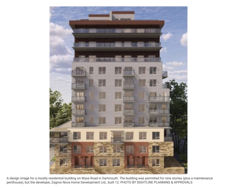 眼看位于Dartmouth,169 Wyse Rd. 的一栋住宅楼即将竣工,哈利法克斯市政人员却发现这栋楼竟比原规划高出了两层。