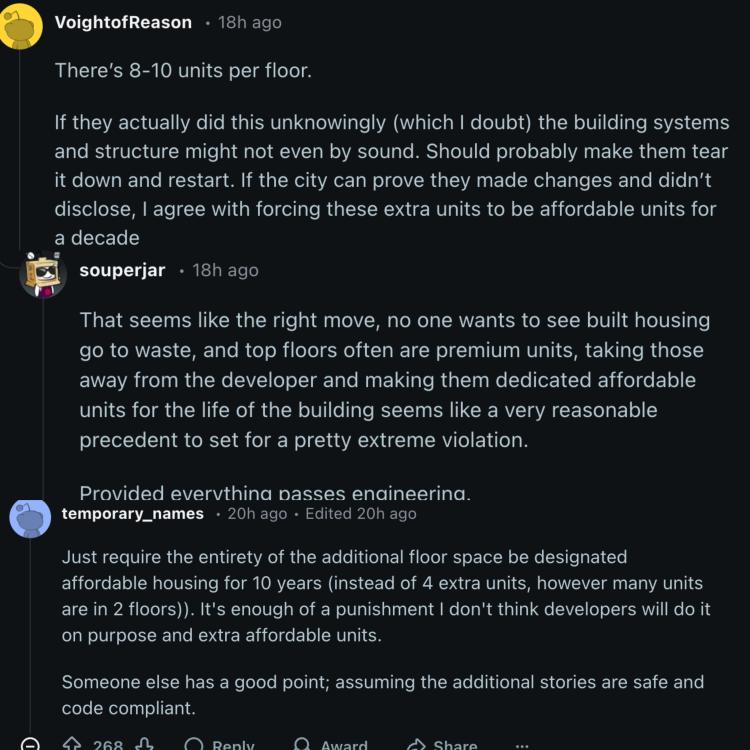 Reddit上,网友们不信开发商智商突然掉线,手滑多盖两层,同时也认为在住房短缺的大背景下,拆除已经盖好的房子实在浪费。大家不约而同想到提出一个既不浪费资源,又不会鼓励开发商钻空子的高招,那就是——将违建的17个单位都划定为经适房,用来出租!