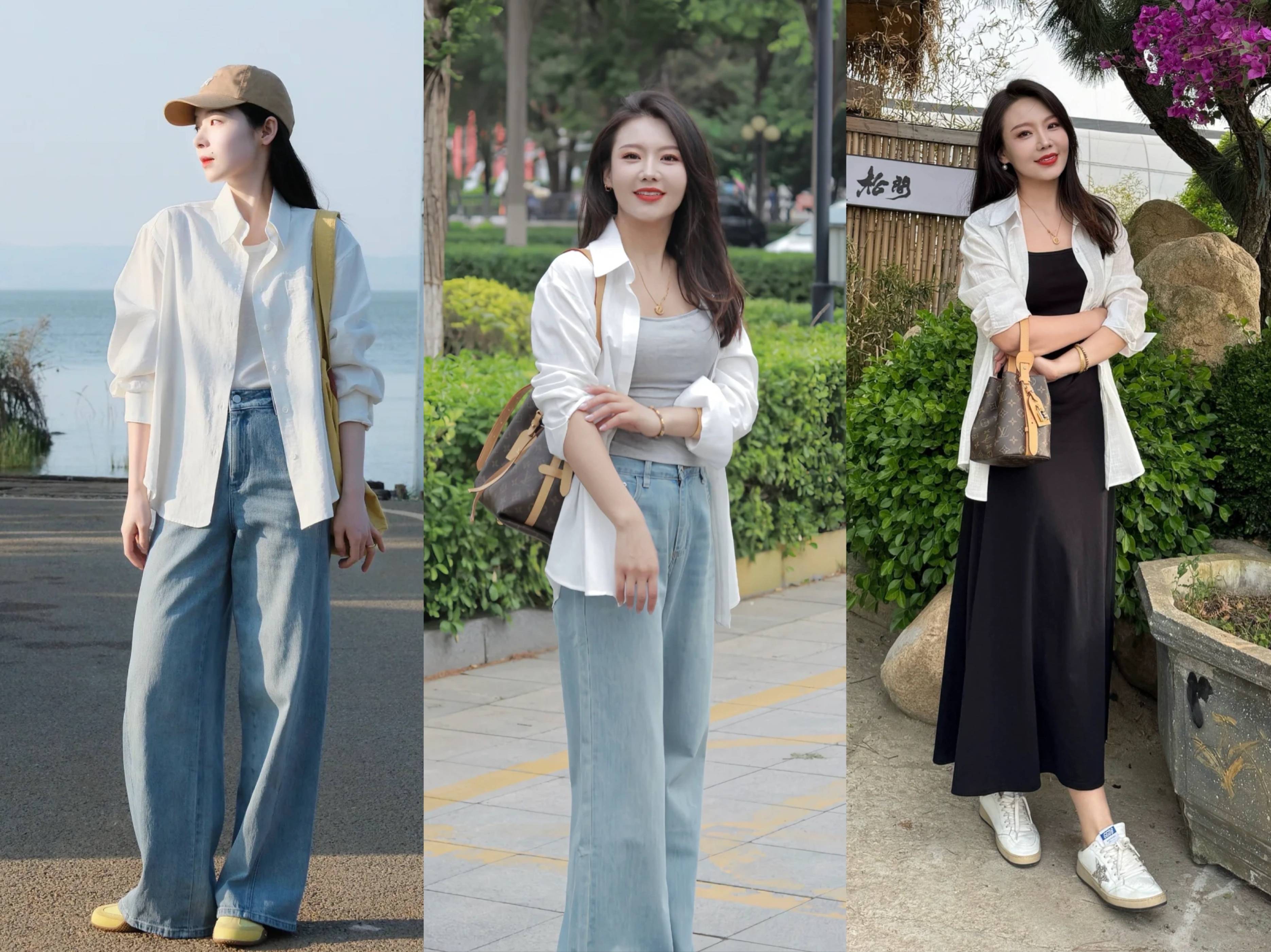 当然,除了叠穿,白衬衫还可以当做外套穿,选择版型稍微宽松一点的白衬衫,内搭同色系T恤或者小吊带,下半身搭配牛仔阔腿裤,打造简约又清新的春季小清新穿搭,在搭配连衣裙的时候,比如黑色吊带连衣裙,可以套一件白色衬衫,简约又高级优雅。