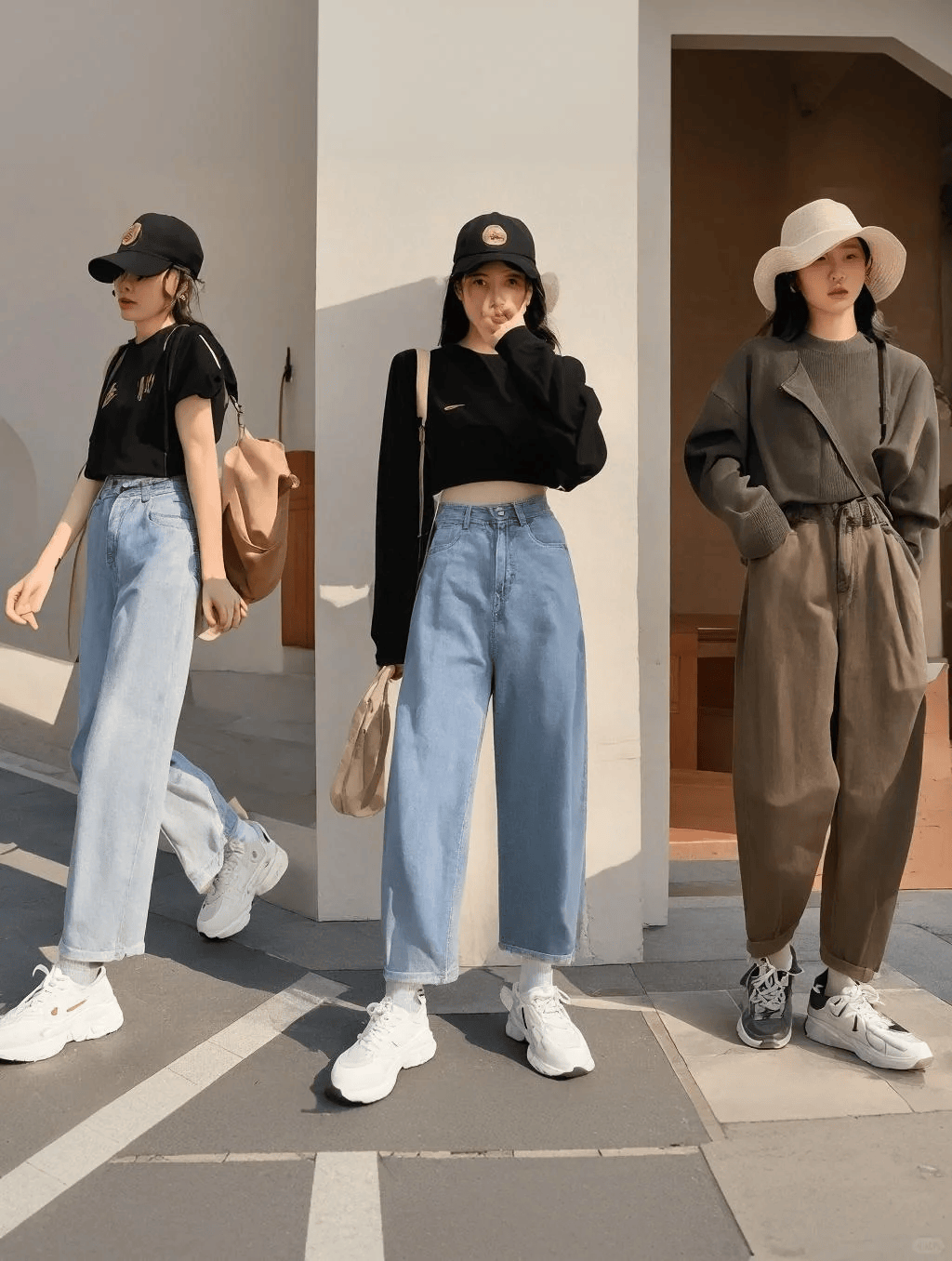 推荐选择烟管裤、萝卜裤等锥形裤的版型,选择九分裤长,搭配白色帆布鞋,露脚踝的搭配更显瘦。