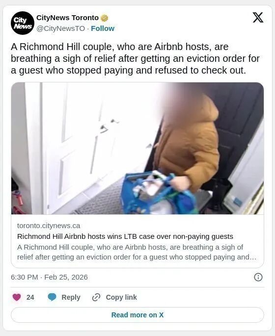“通过LTB处理的案件通常不会很快结案”,她说,“如果当初房东仅依据Airbnb合同处理,租客可能更早就被要求离开。据我了解,在平台规则下,不付款就不能继续入住”。