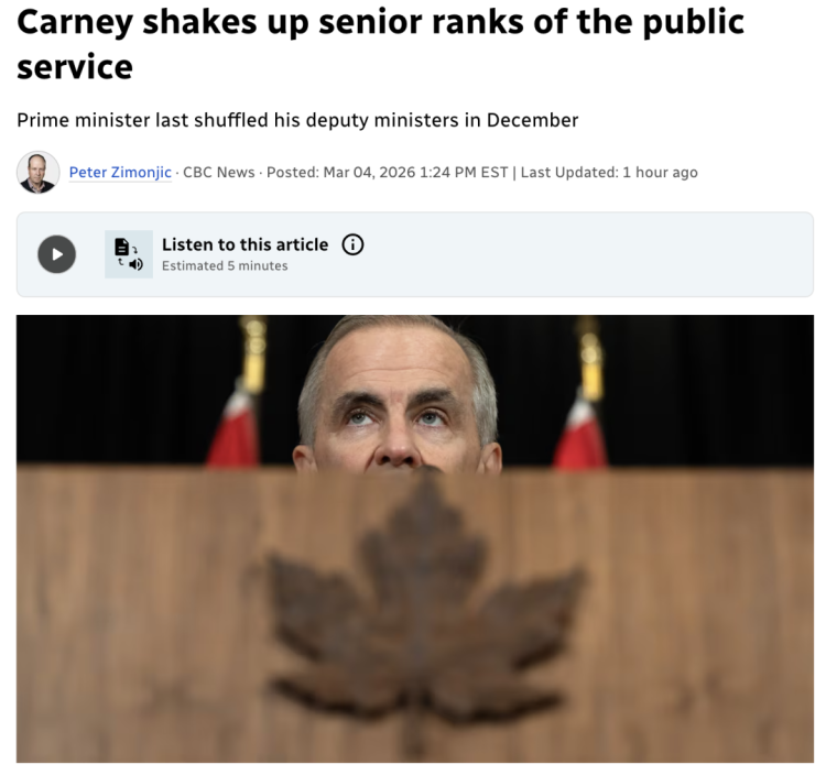 周三(3 月 4 日),加拿大总理马克·卡尼(Mark Carney)宣布对联邦公务员系统的高层进行大规模调整。这是卡尼继去年 12 月之后,再次对副部长(Deputy Ministers)级别的高官进行“大洗牌”。