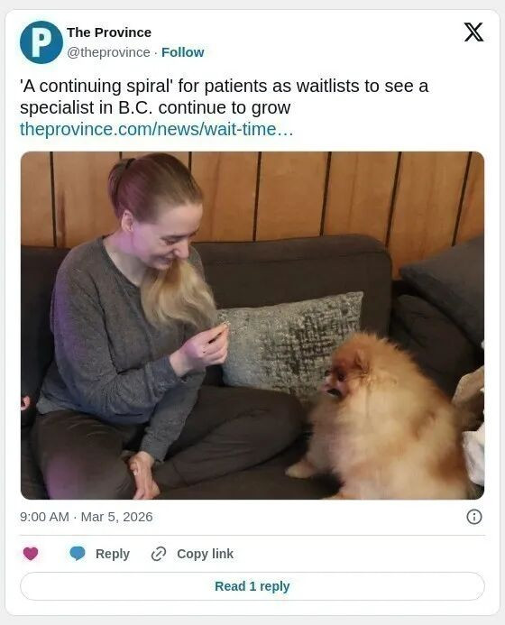 类似经历在社交媒体和论坛上屡见不鲜,许多BC省居民表示等待专科医生超过一年。