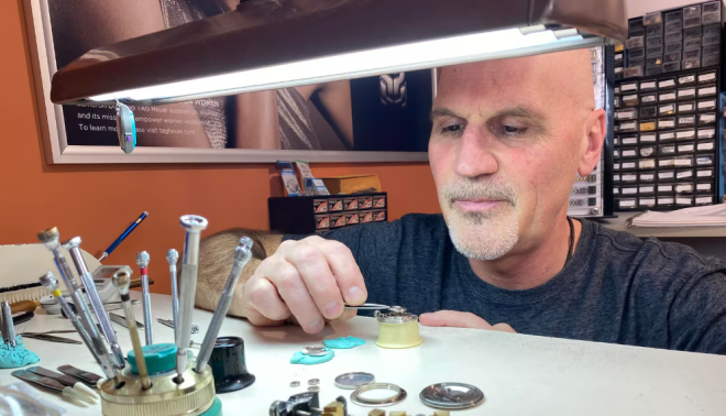 他在西加拿大各地都有客户。每次修好手表后,他都会根据客户所在的时区设置时间。