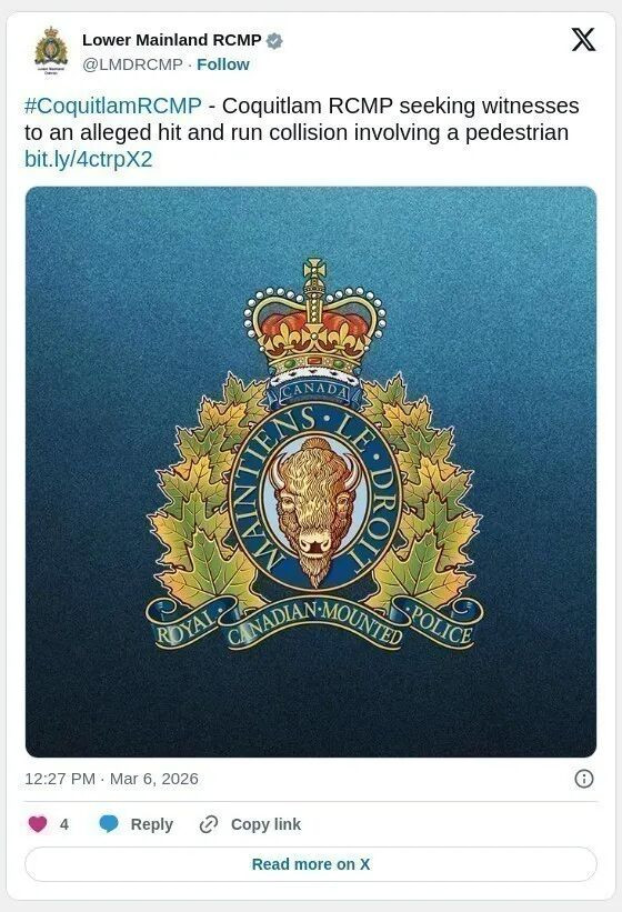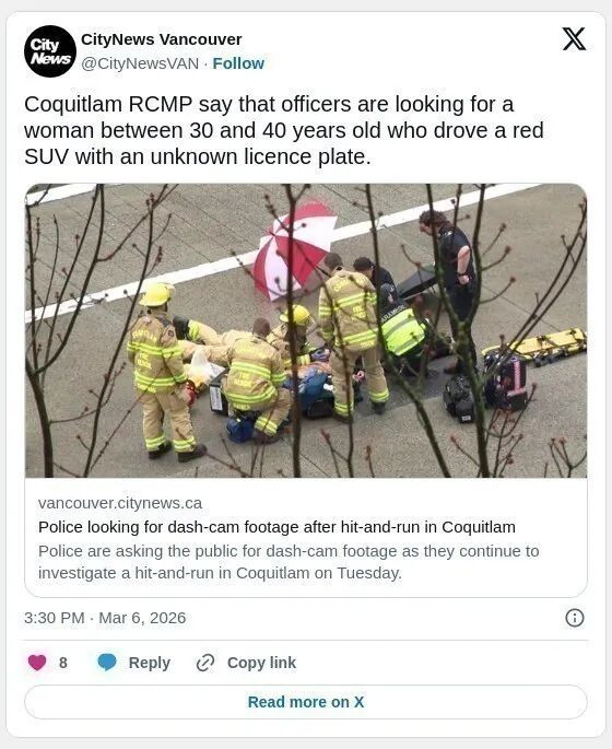“任何在 3 月 3 日下午 1 点至 1 点 10 分之间出现在高贵林Atlantic Avenue和The High Street 附近的人,如果目睹了这起事件或有行车记录仪拍到这起事件,请联系高贵林皇家骑警,电话:604-945-1550.案件编号 2026-5372”,皇家骑警补充道。