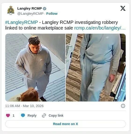 警方呼吁任何知情人士或认出嫌疑人的人士致电兰里皇家骑警 604-532-3200.并引用档案编号 2026-7422.