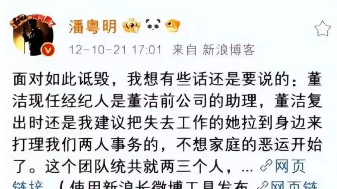 2026年3月7日深夜,潘粤明的微博突然更新了八个字:“一定要这么现实吗……”二十分钟后,他又在评论区补了一句:“祈祷这个世界早日和平。 ”没有配图,没有点名,但全网瞬间炸了。 因为就在同一天,他的前妻董洁,在访谈里红着眼眶说出了那句:“当年太任性,不成熟。 ”