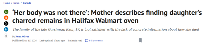 据此前National Post报道,这对母女在三年前从印度移民到加拿大。2024年10月19日周六晚上,她们都在该市西区Mumford Road的沃尔玛门店上班。当晚Mandip发现自己联系不上女儿——发短信和打电话都没有回应。