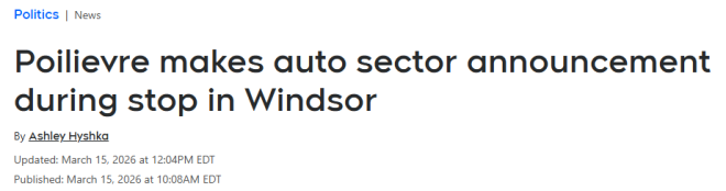 周日(3月15日),在加拿大汽车工业核心城市之一温莎(Windsor)访问期间,保守党领袖博励治(Pierre Poilievre)提出一项计划,希望通过新的免关税汽车协议以及扩大进入美国市场的机会,提升加拿大的汽车产量。