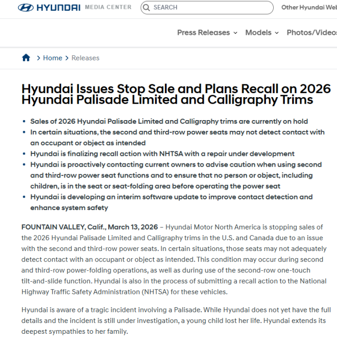 现代汽车(Hyundai Motor)宣布,将在美国和加拿大停止销售部分2026款Palisade SUV,并启动召回。